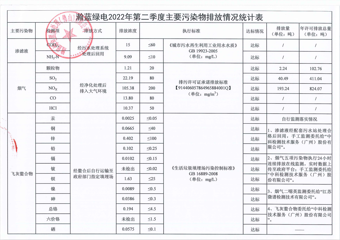 2022年第二季度主要污染物排放情况统计表