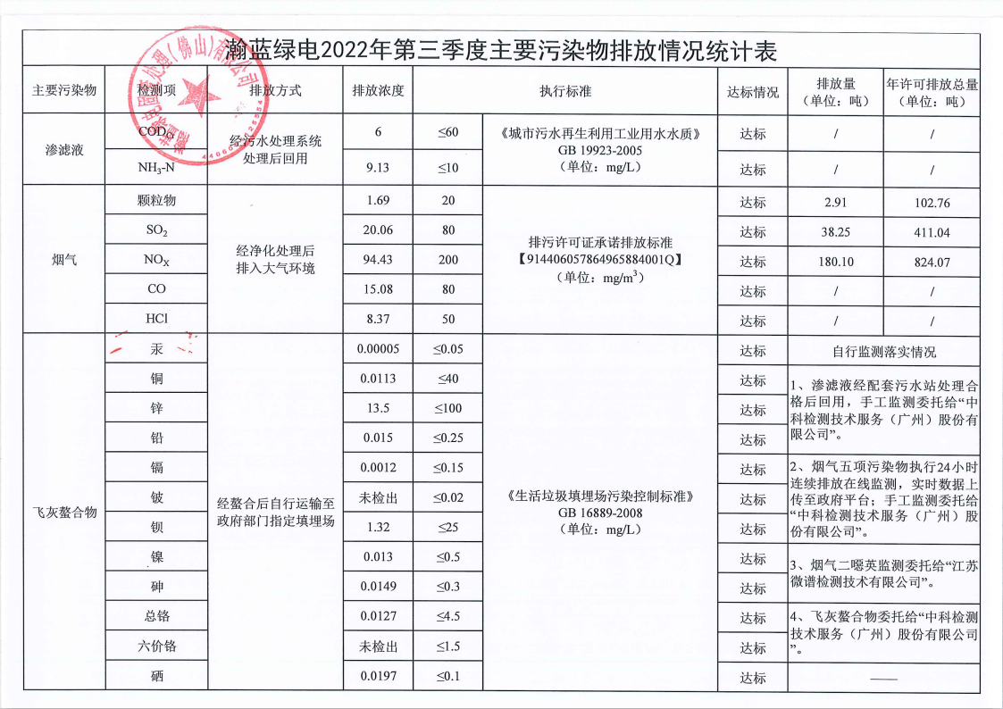2022年第三季度主要污染物排放情况统计表