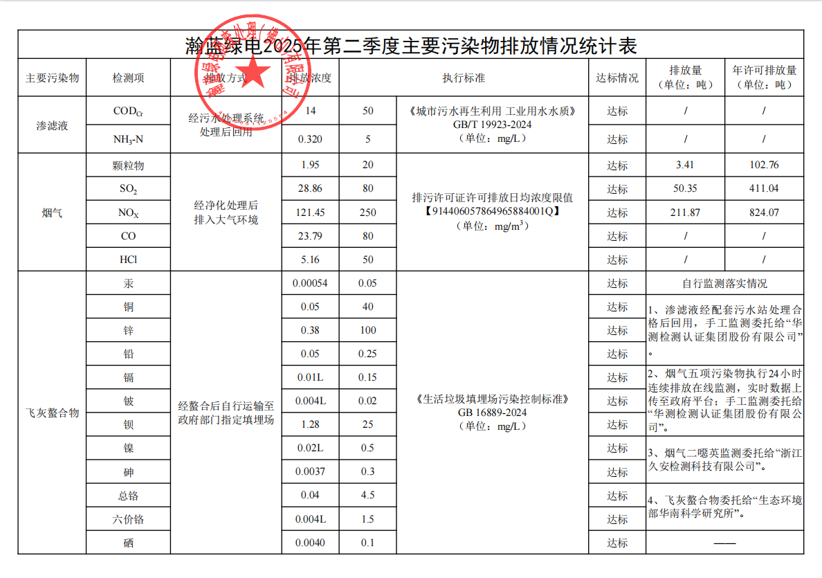 2025年第二季度主要污染物排放情况统计表